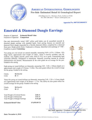 2.66 cts Colombian Emeralds and 2.51 cts Diamond Earrings on 14K Yellow Gold
